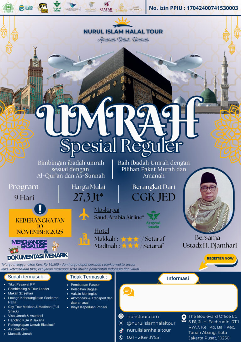 Nurul Islam Halal Tour merupakan perusahaan travel resmi yang bergerak di bidang penyelenggaraan perjalanan ibadah Umrah, Haji, Wisata Religi, serta Wisata Halal domestik maupun mancanegara. Berdiri dengan landasan profesionalisme dan pelayanan prima, perusahaan ini telah mengantongi izin resmi dari Kementerian Agama Republik Indonesia (PPIU No. 17042400741530003) dan Izin Resmi dari Kementerian Pariwisata (NIB 2102250078601).